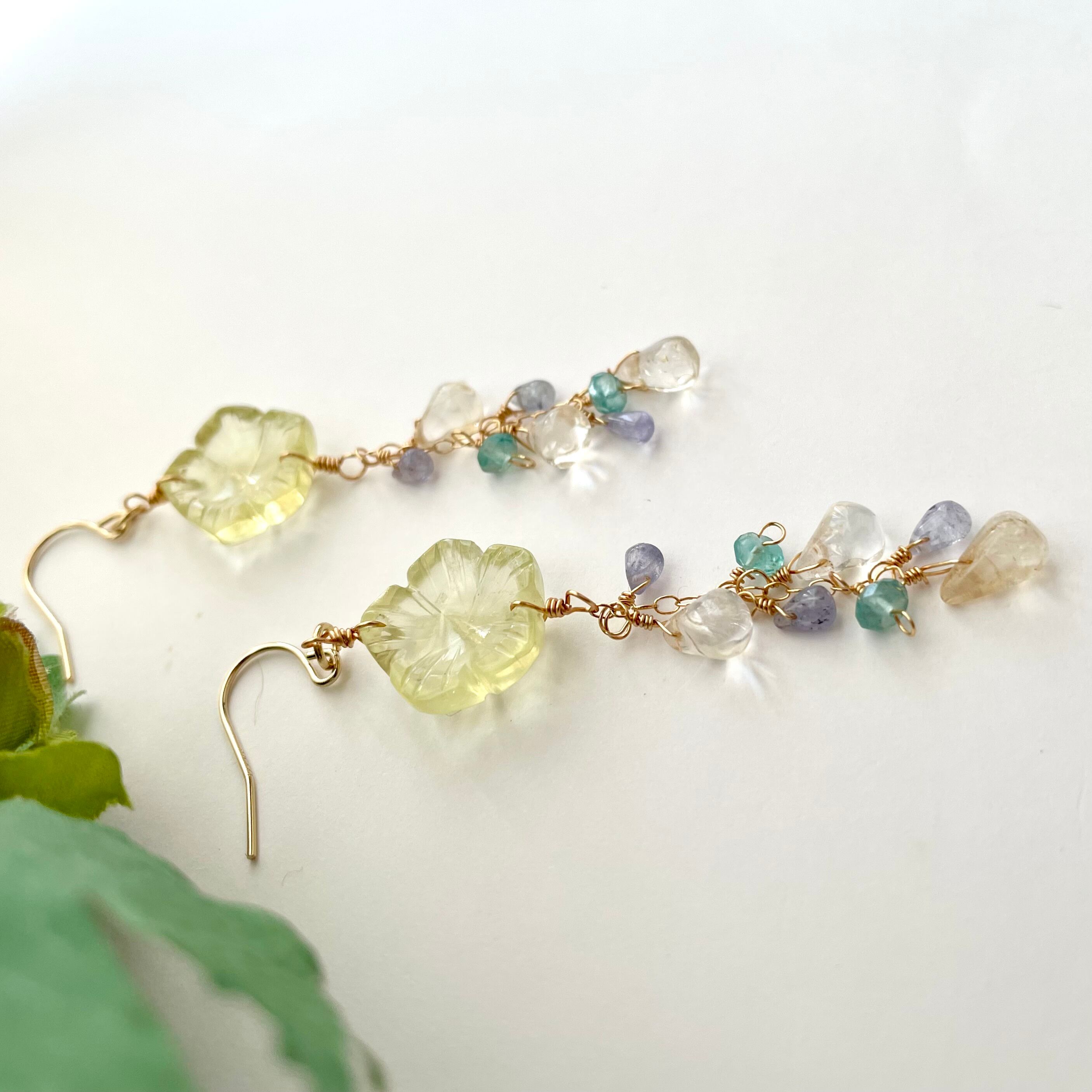 フラワーカービング❁レモンクォーツ、シトリン、タンザナイト、アパタイトのピアス