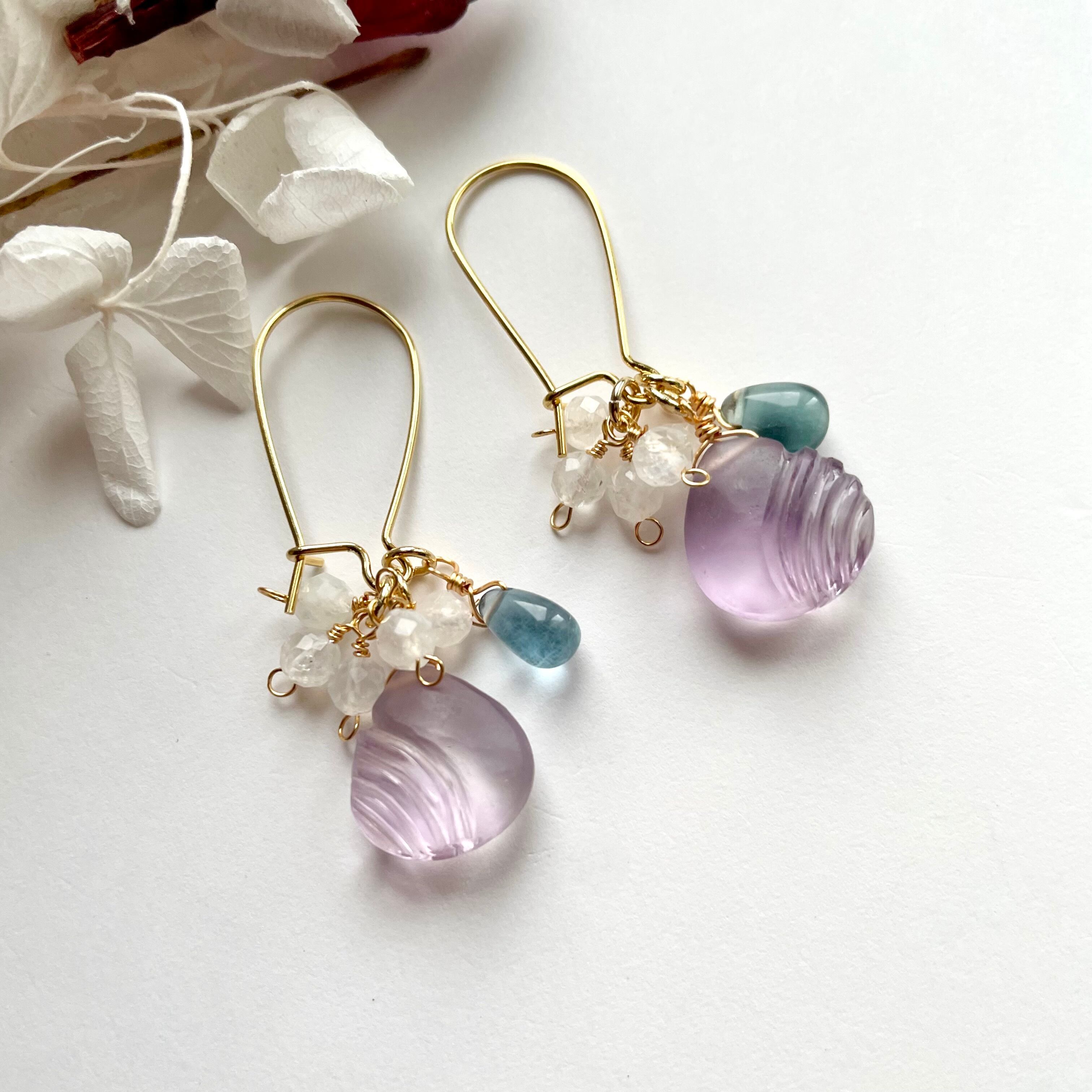 フロスト&カービング୨୧˙˳⋆ピンクアメジスト、フローライト、ブルームーンストーンのキドニーフックピアス