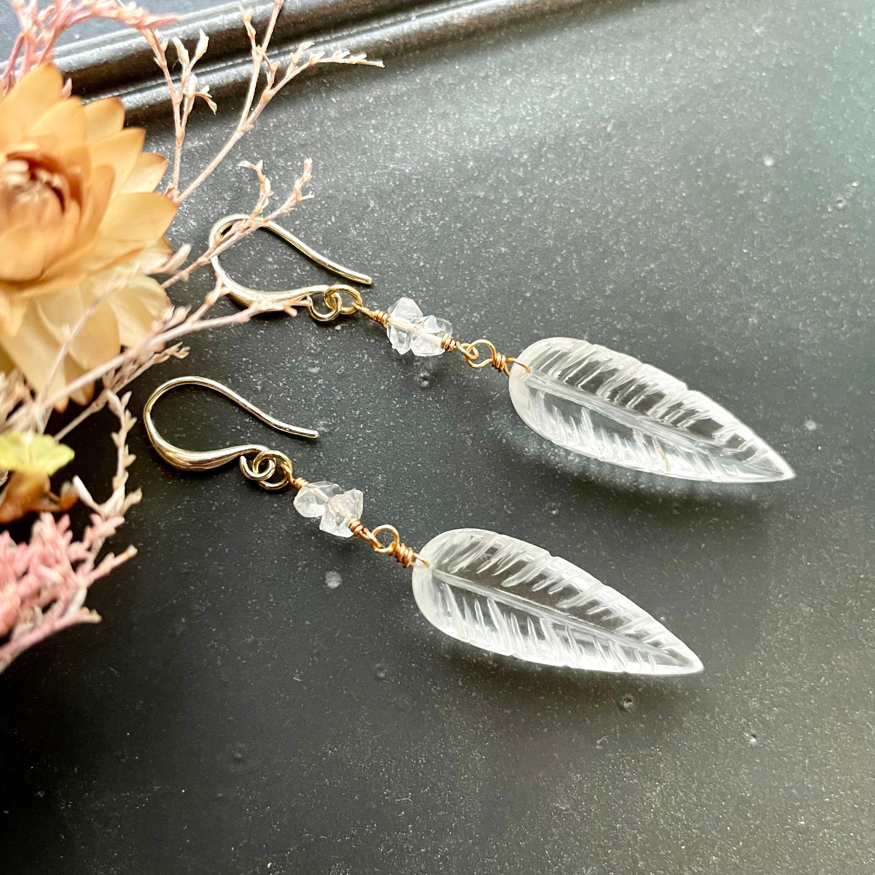 フェザーカービング໒꒱水晶とハーキマーダイヤモンドのピアス