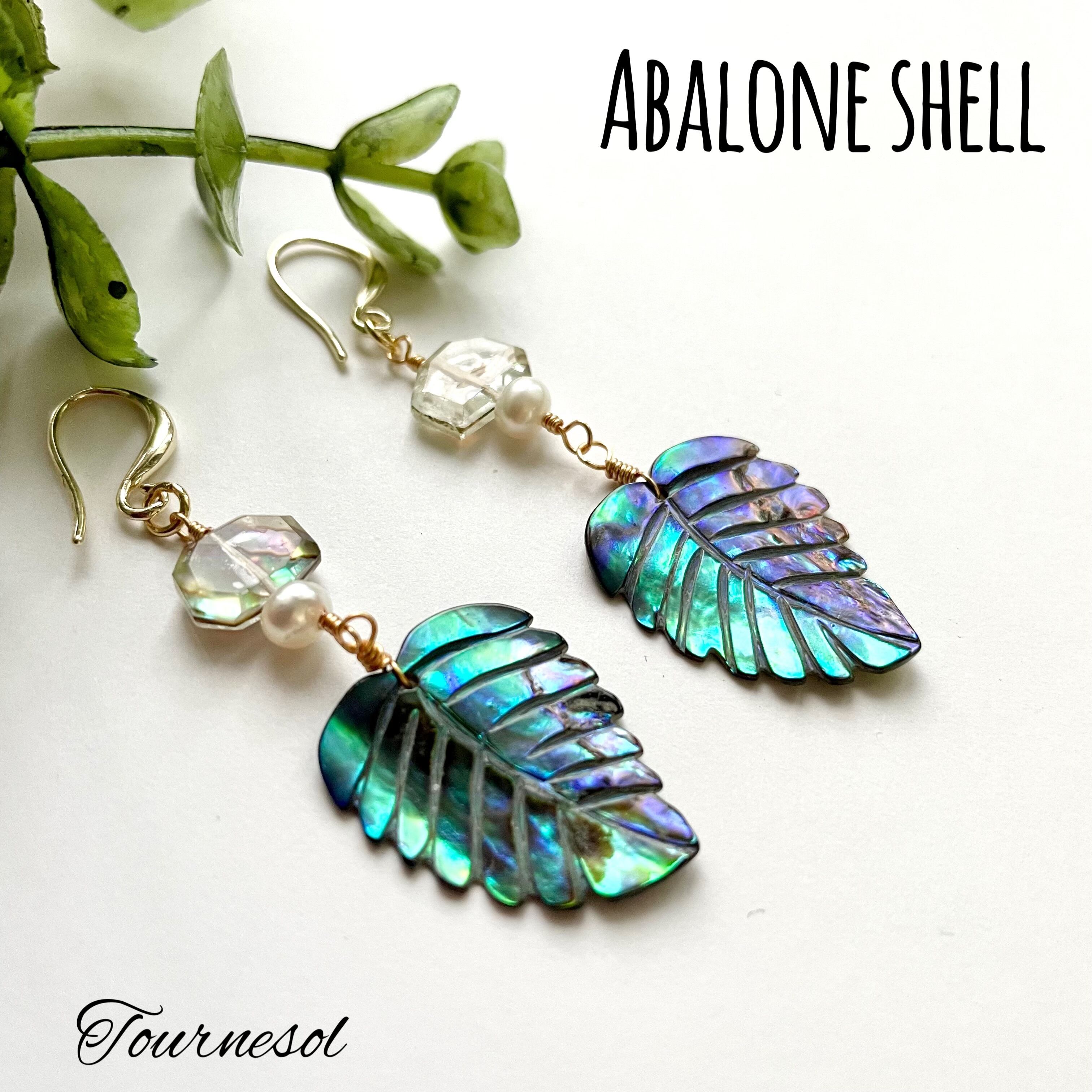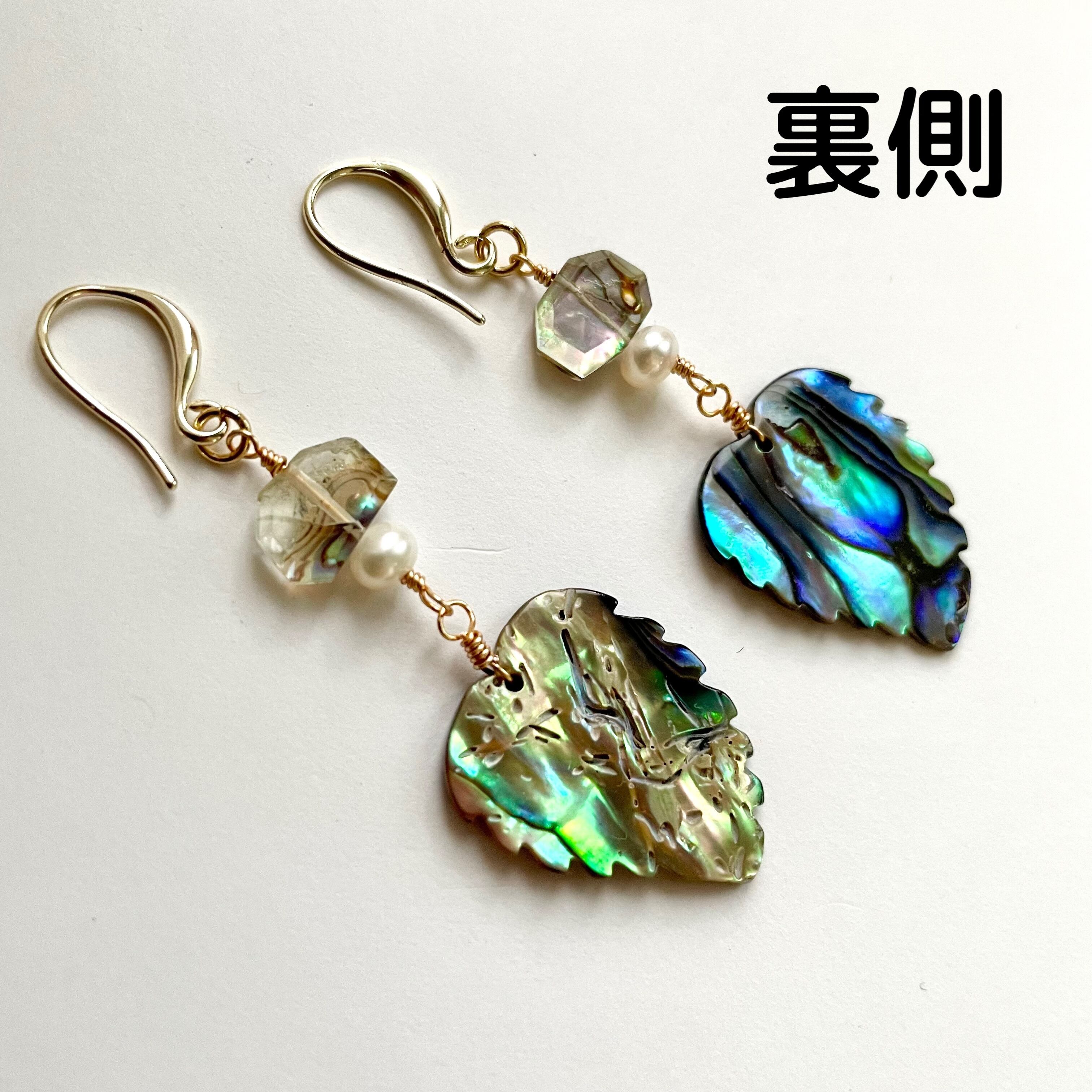 夏☀︎アバロンシェル×クリスタル、淡水パール、リーフカービングのアバロンシェルのピアス