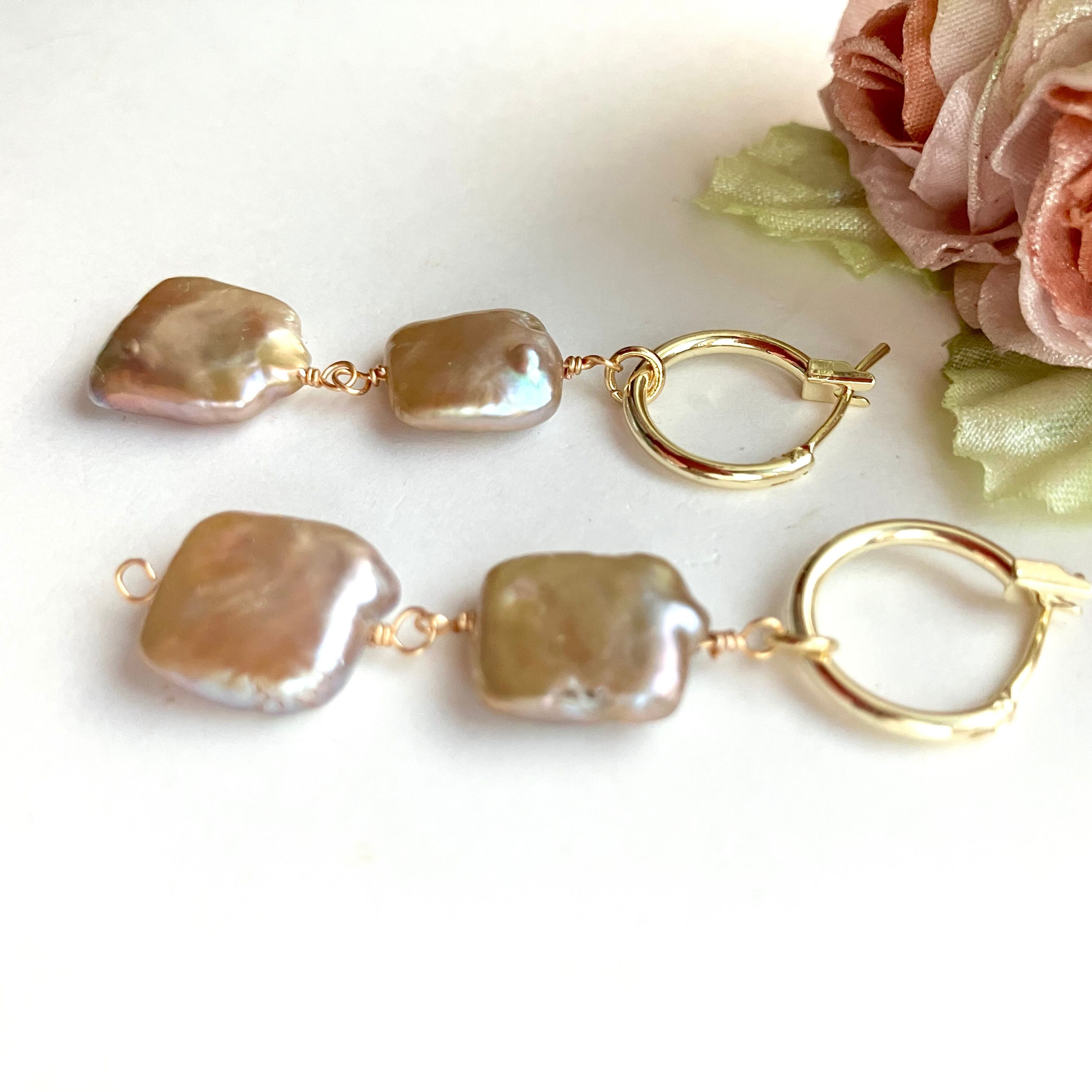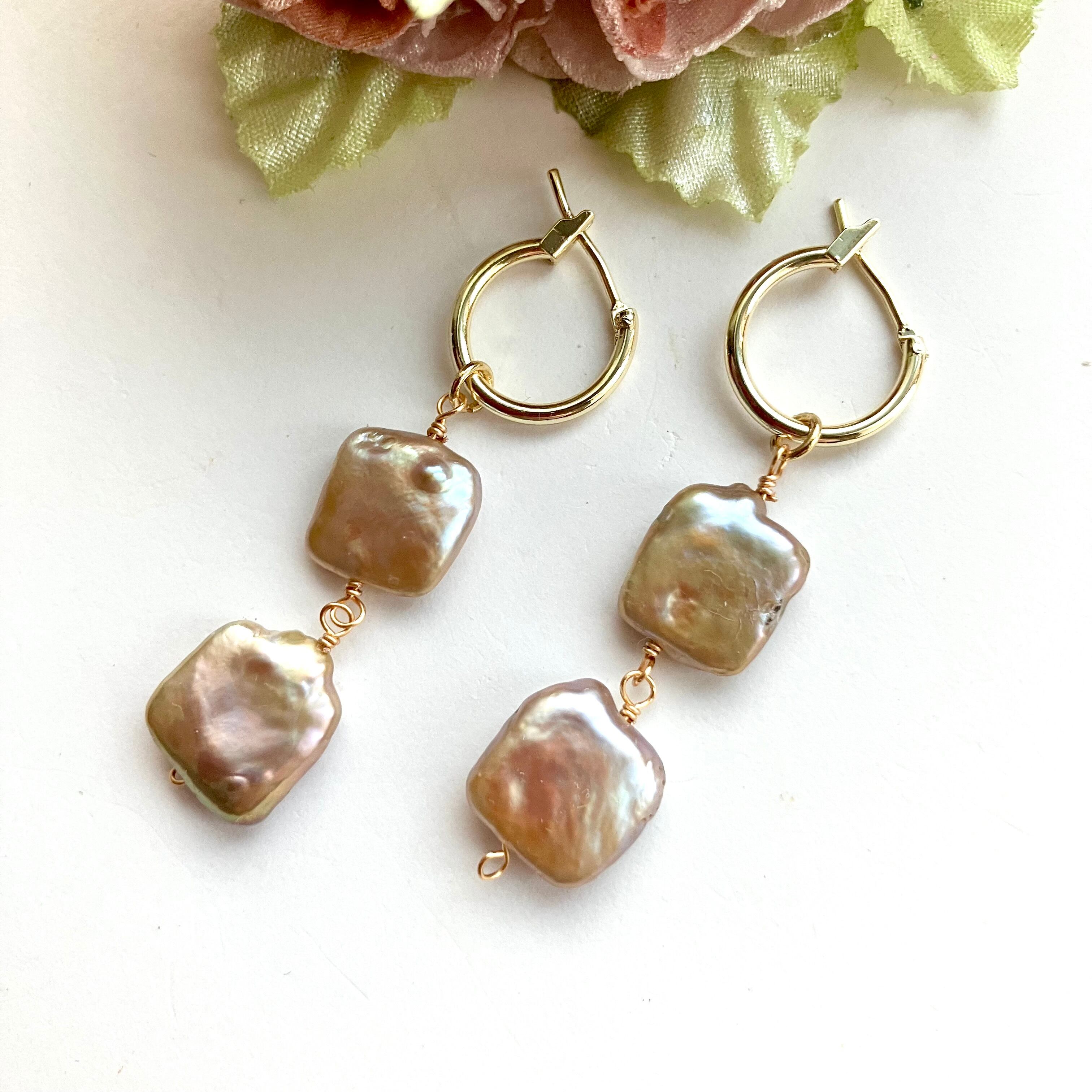 天然色◝☆ 淡水パールバロックスクエアのフープピアス