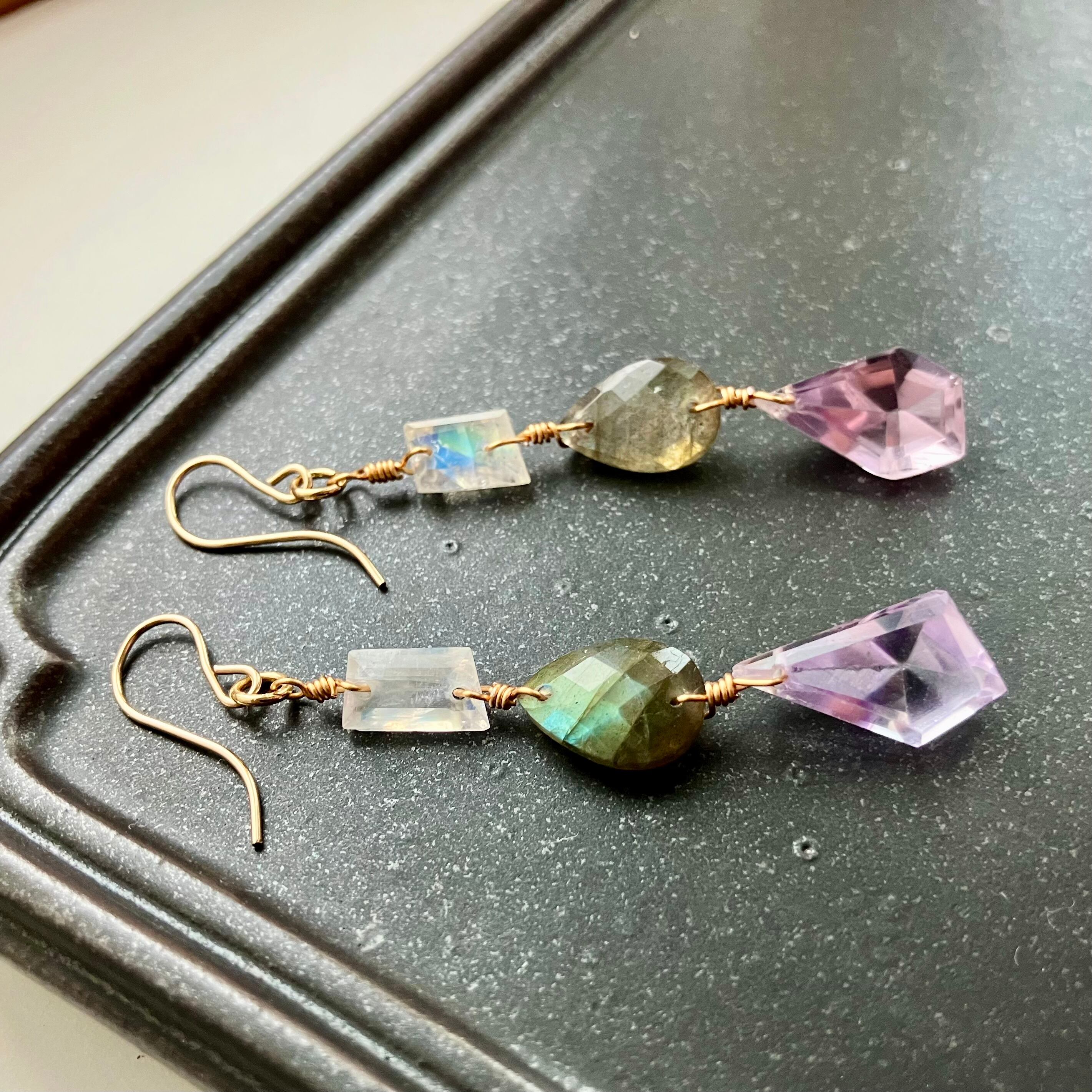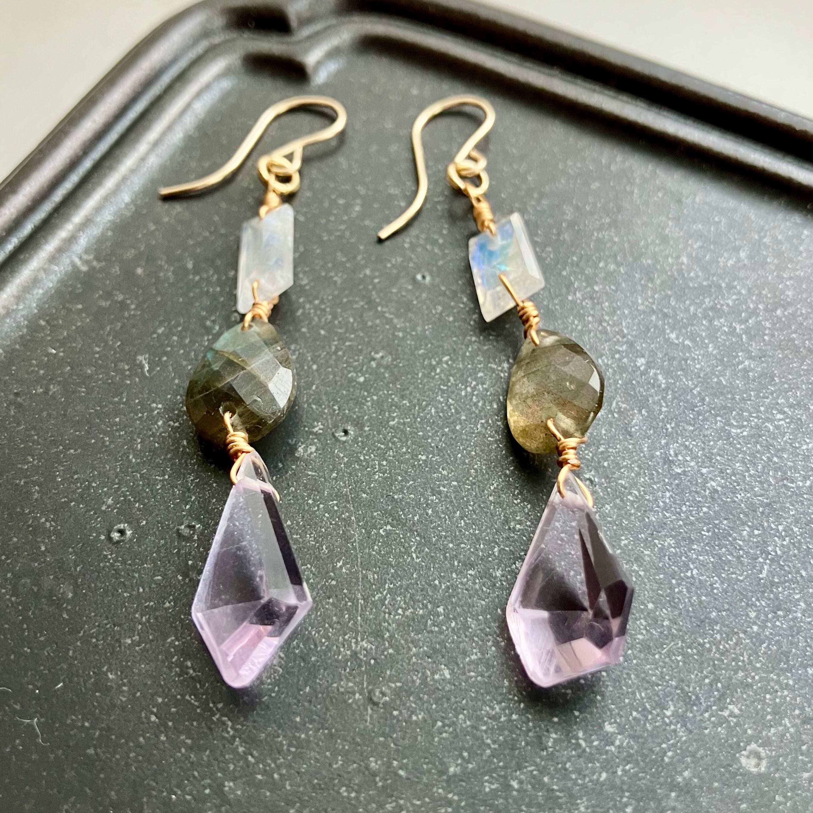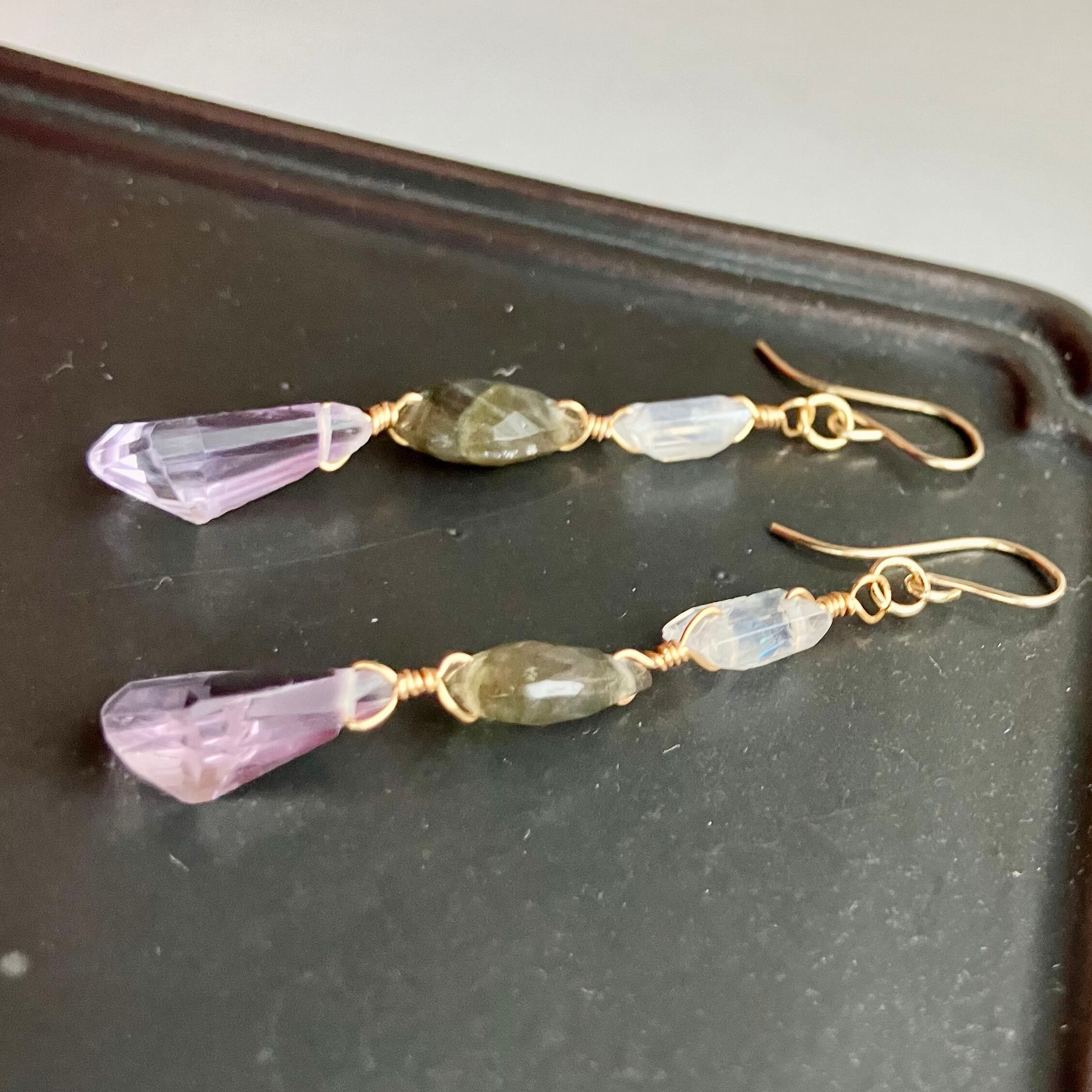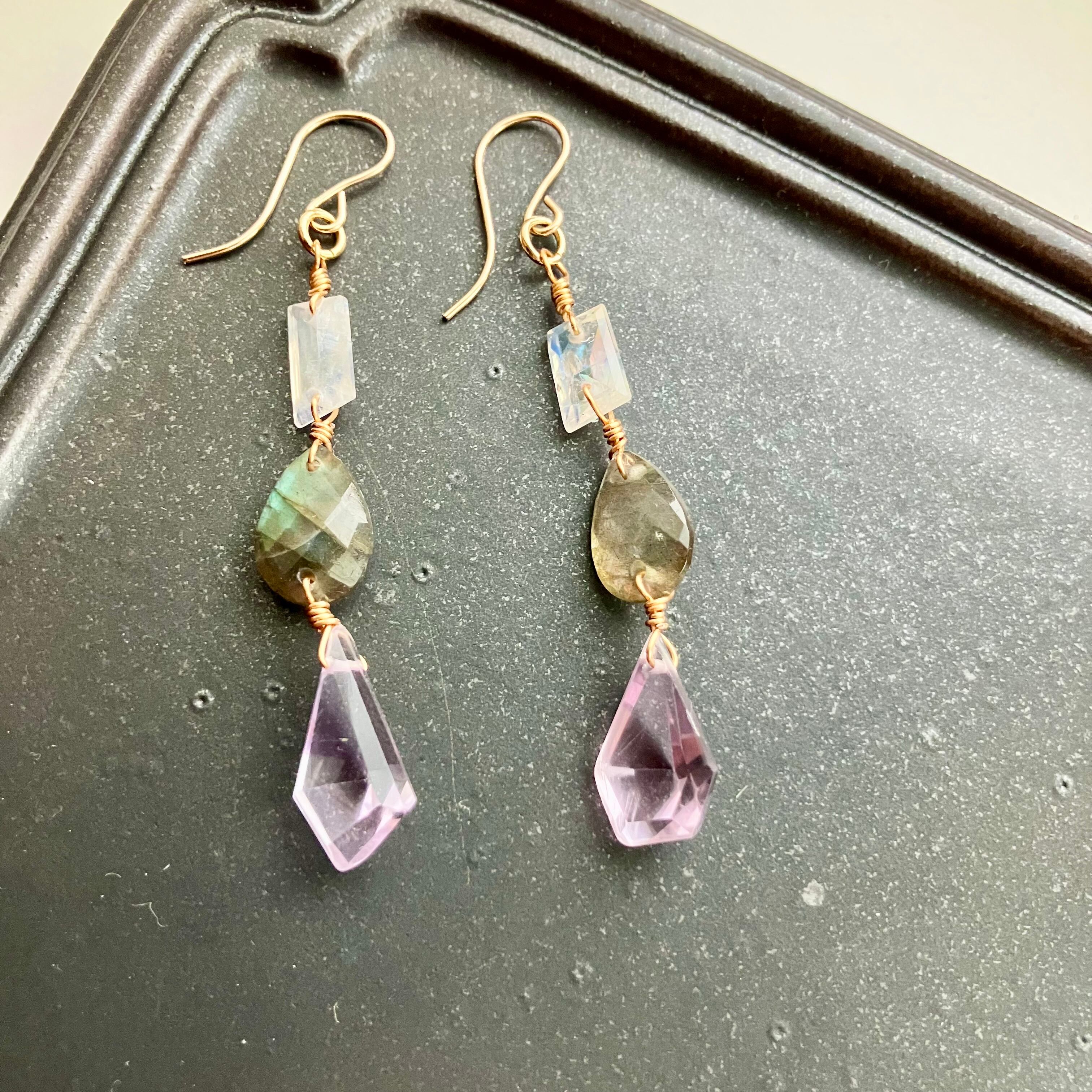 レインボームーンストーン、ラブラドライト、ピンクアメジストのピアス