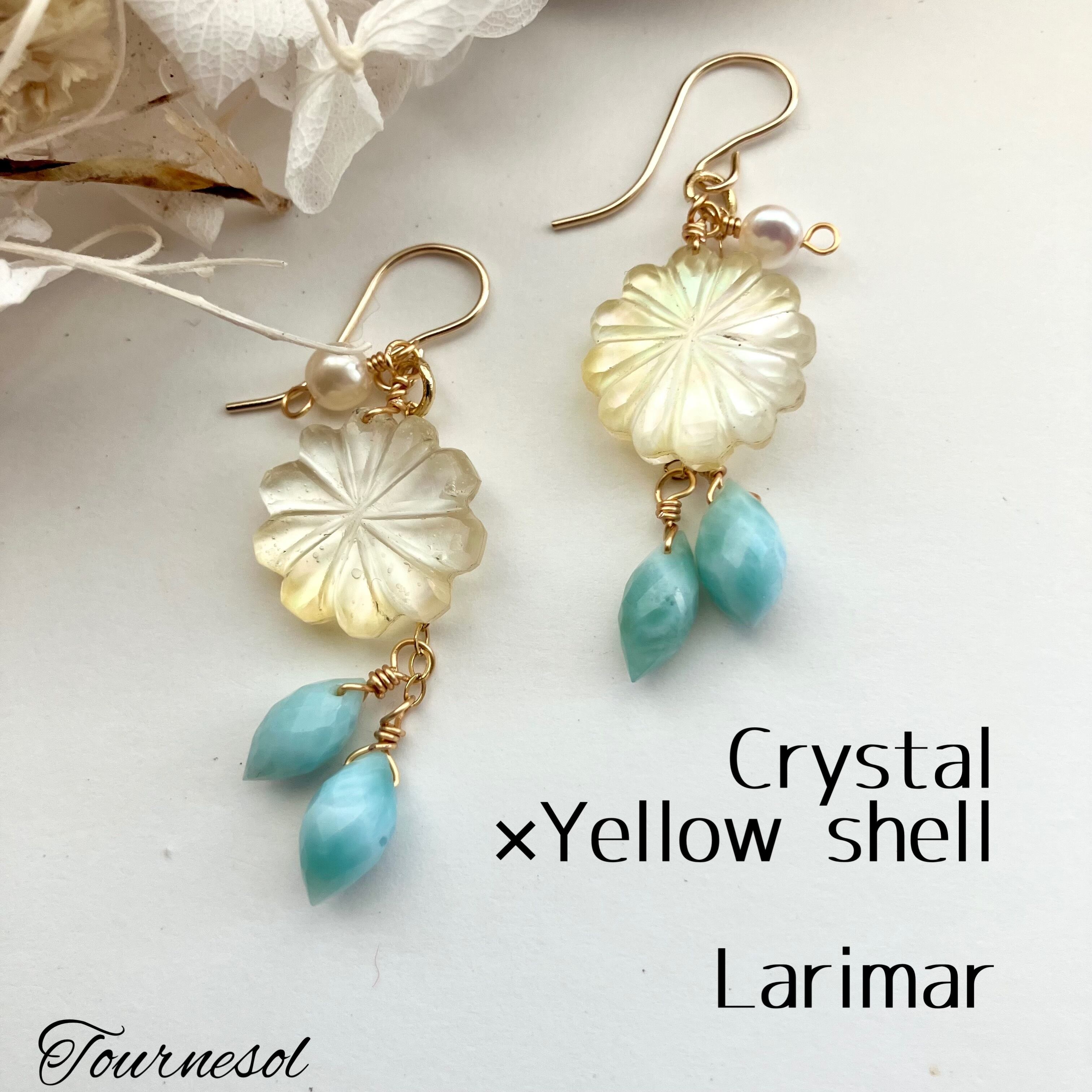 フラワーカービング゚❁ イエローシェル×水晶とラリマーのピアス