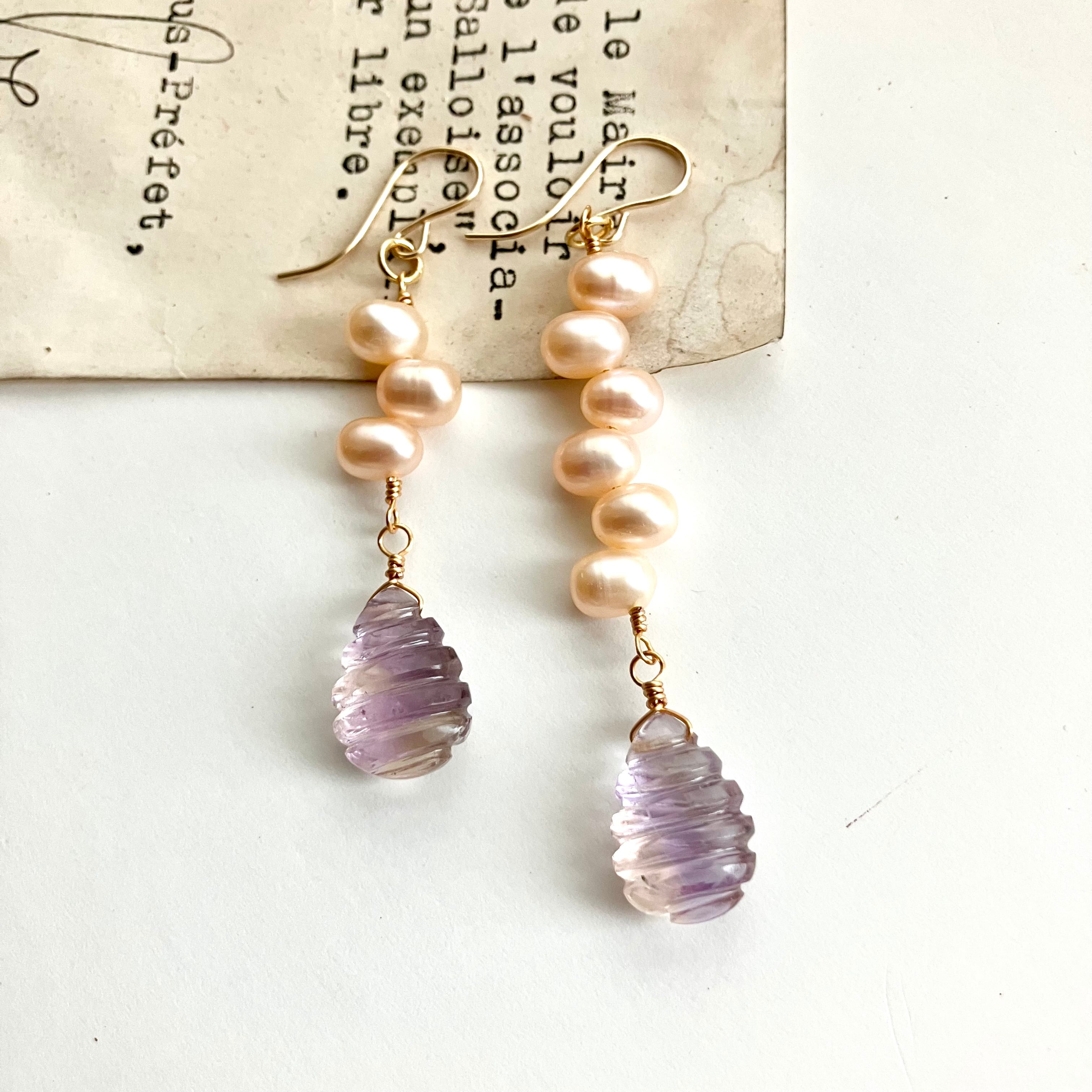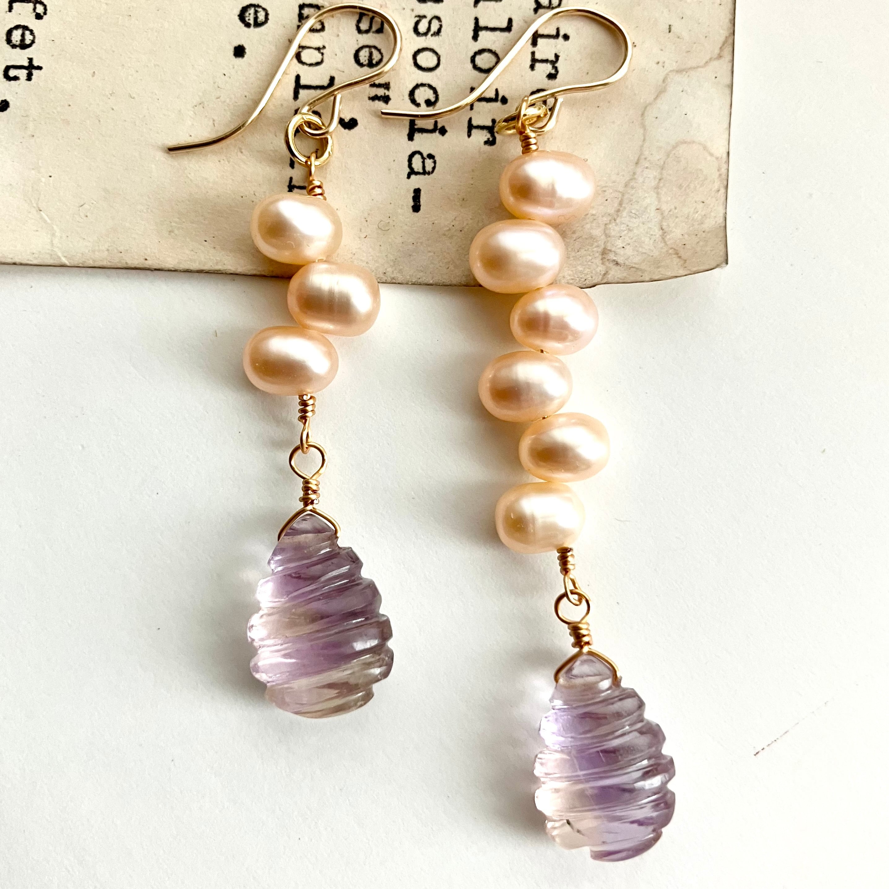 カービング天然石୨୧ アメトリンと淡水パールのアシンメトリーピアス