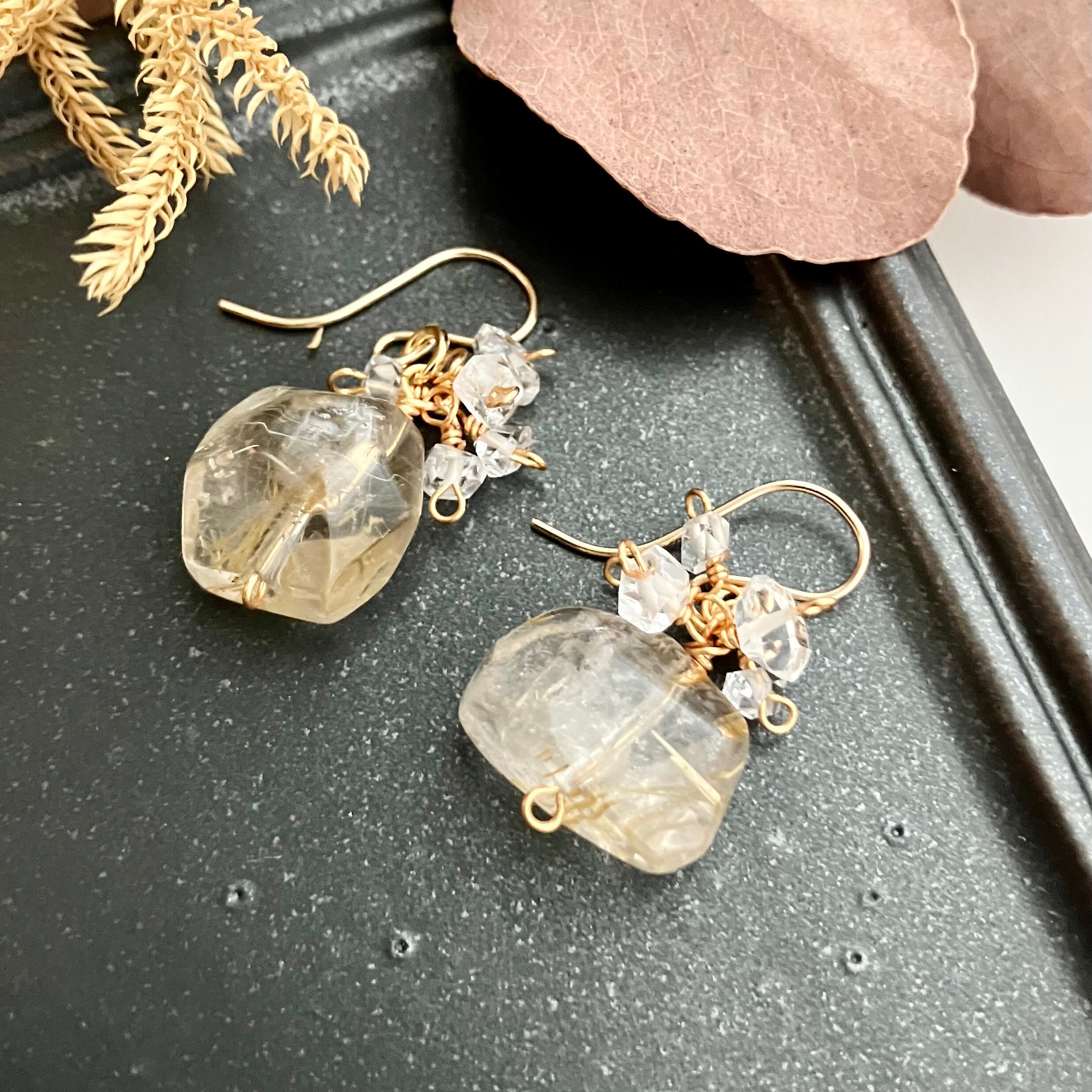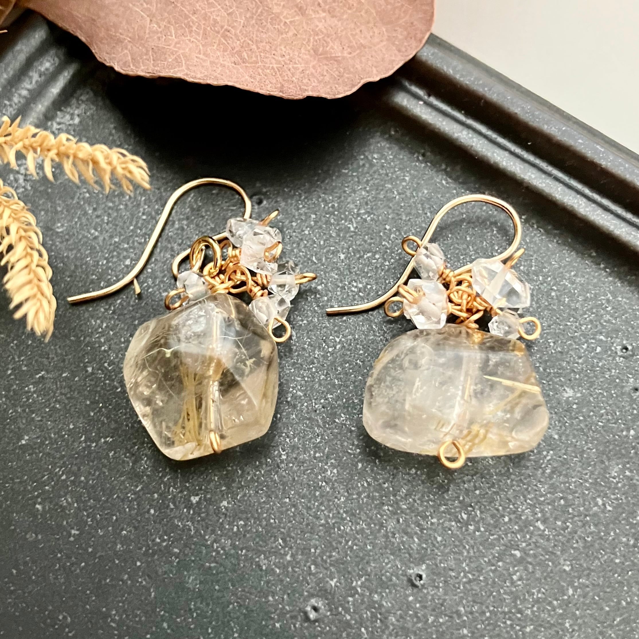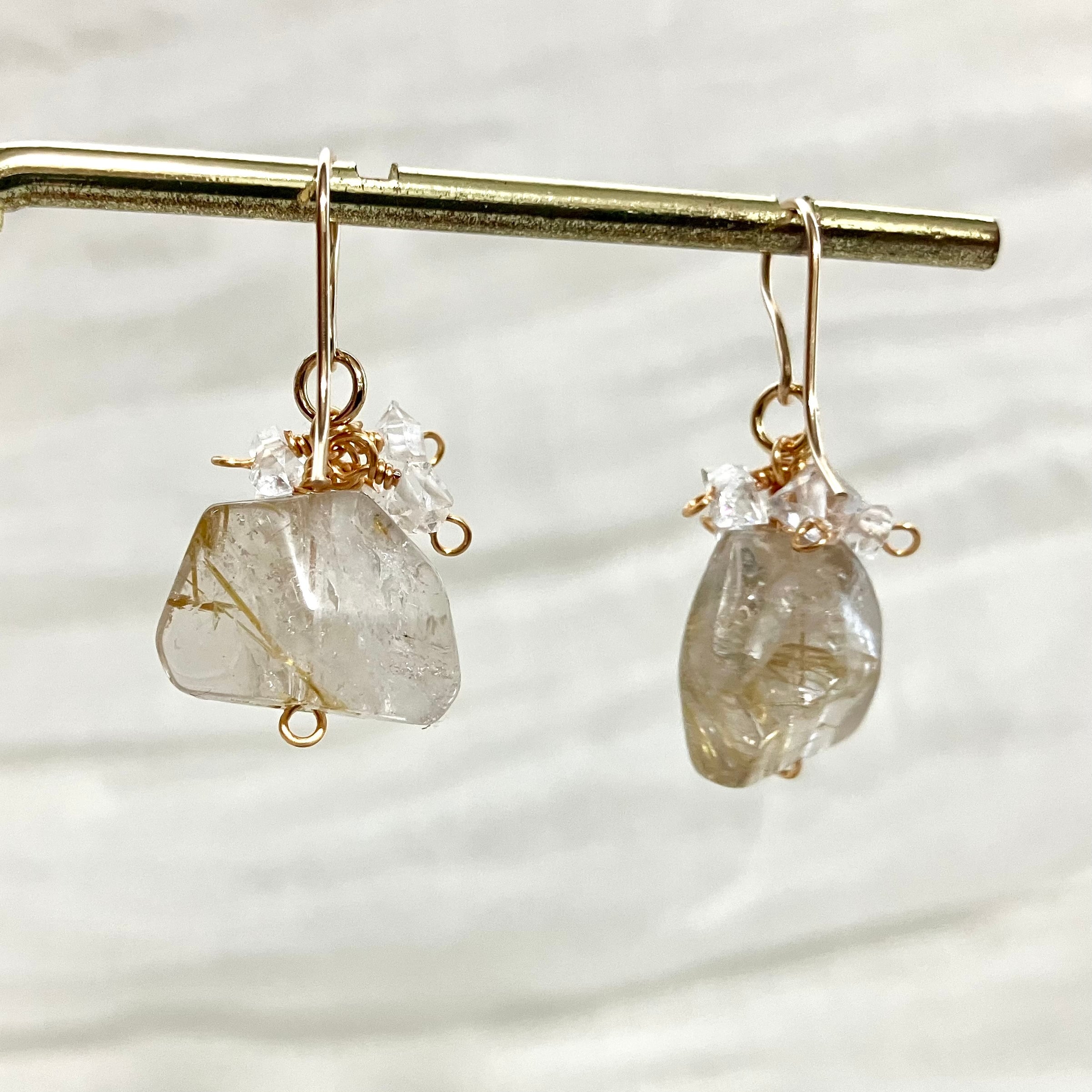ルチルクォーツタンブルとハーキマーダイヤモンドのピアス(小)