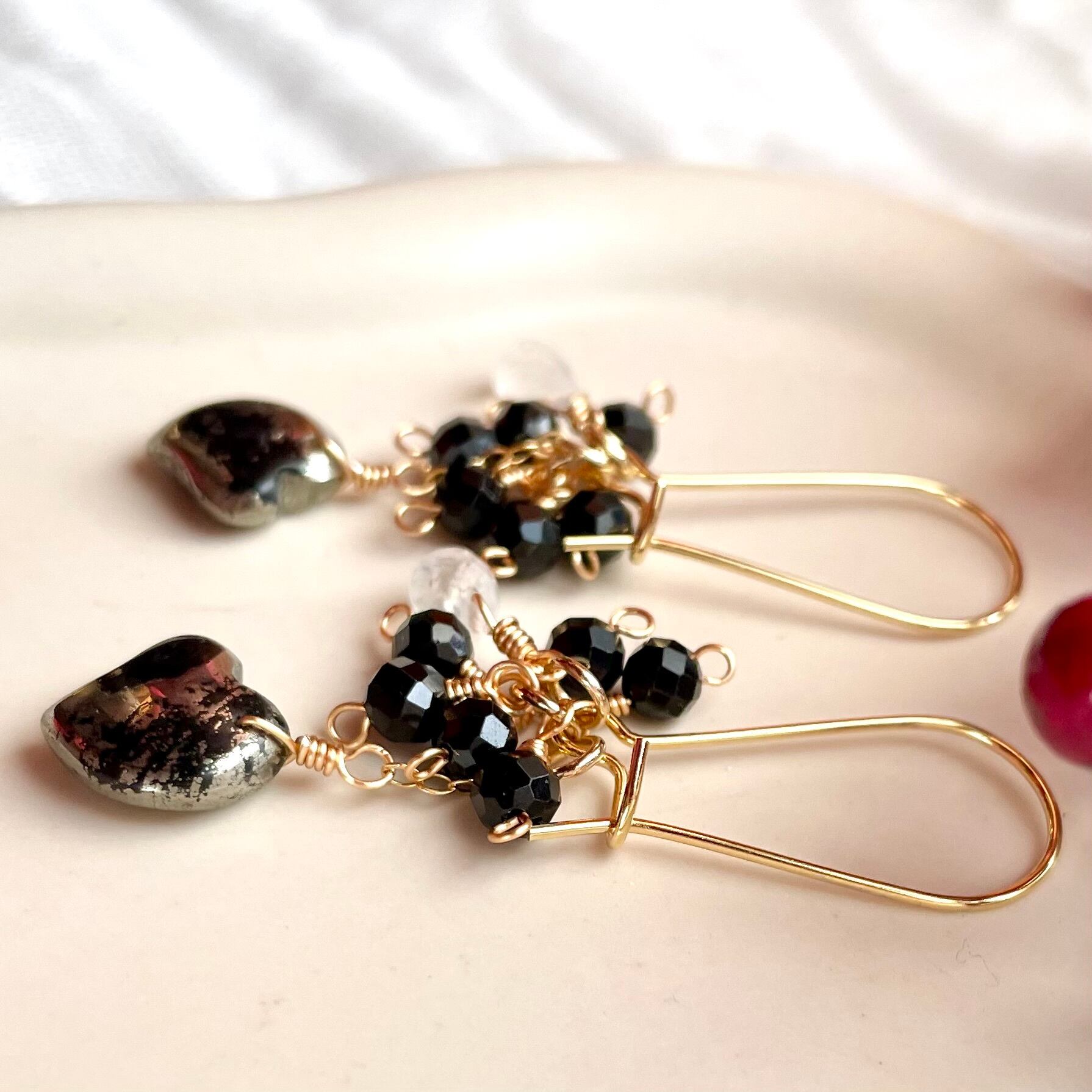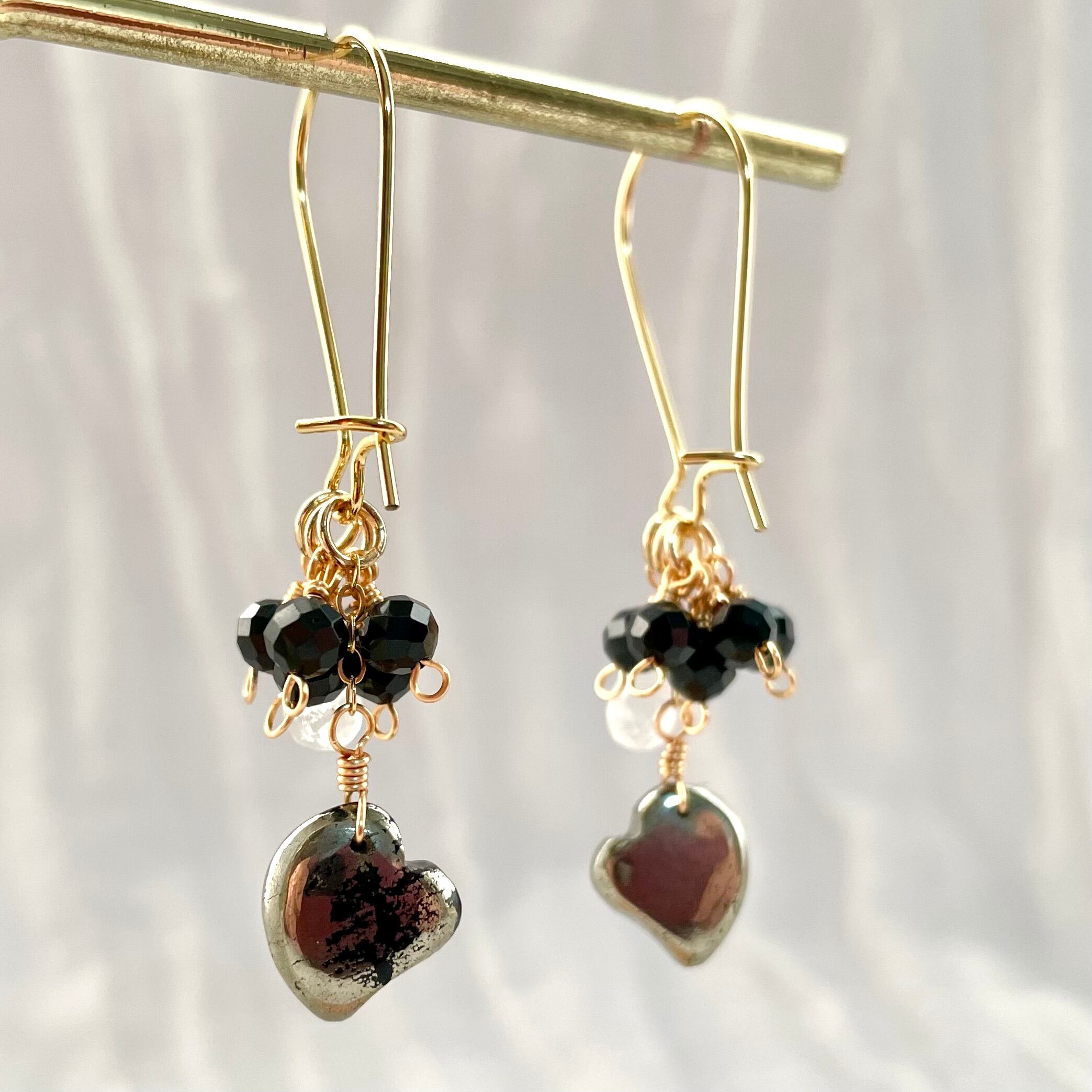 ぶら下がりハート♡ アパッチゴールドとブラックスピネル、宝石質レインボームーンストーンのピアス