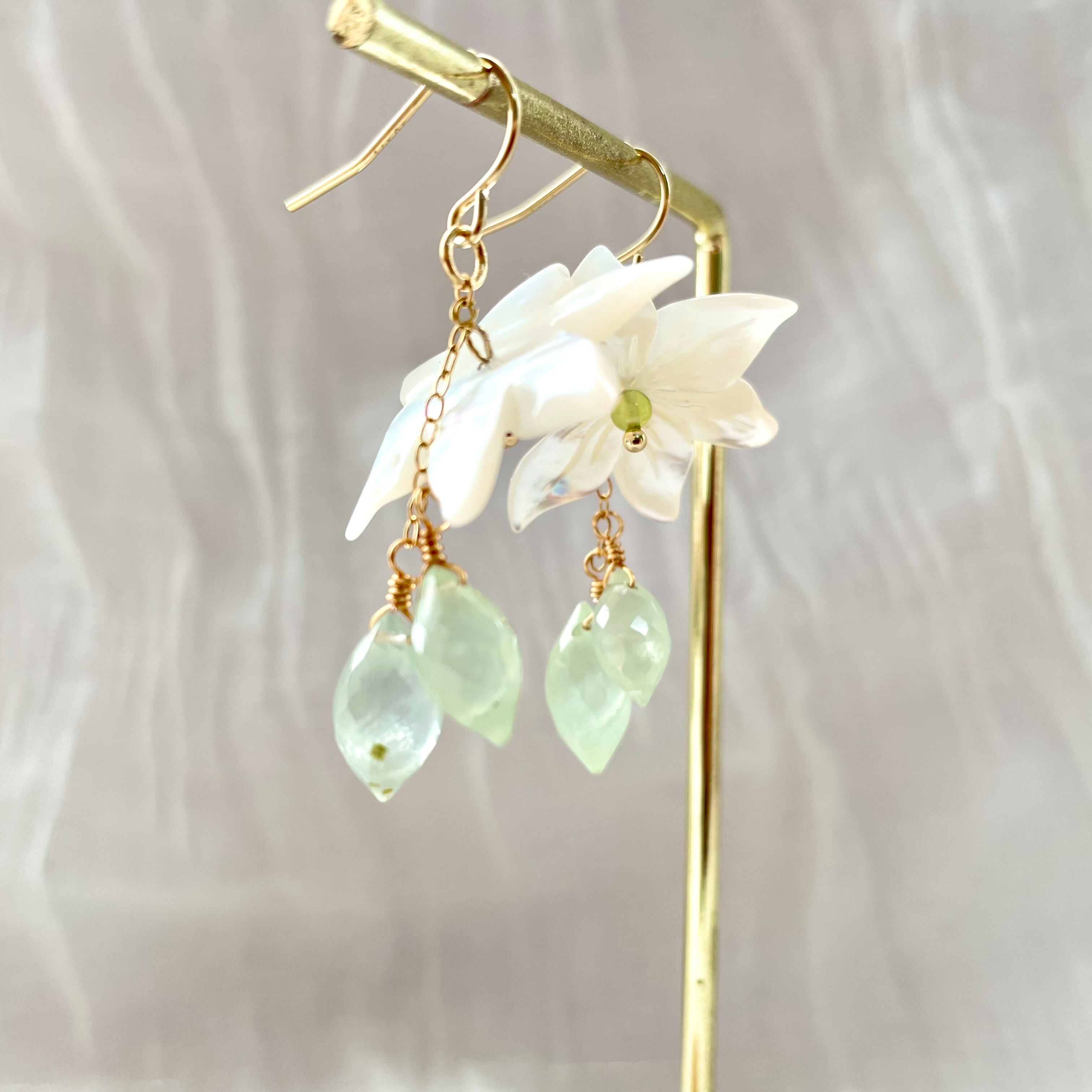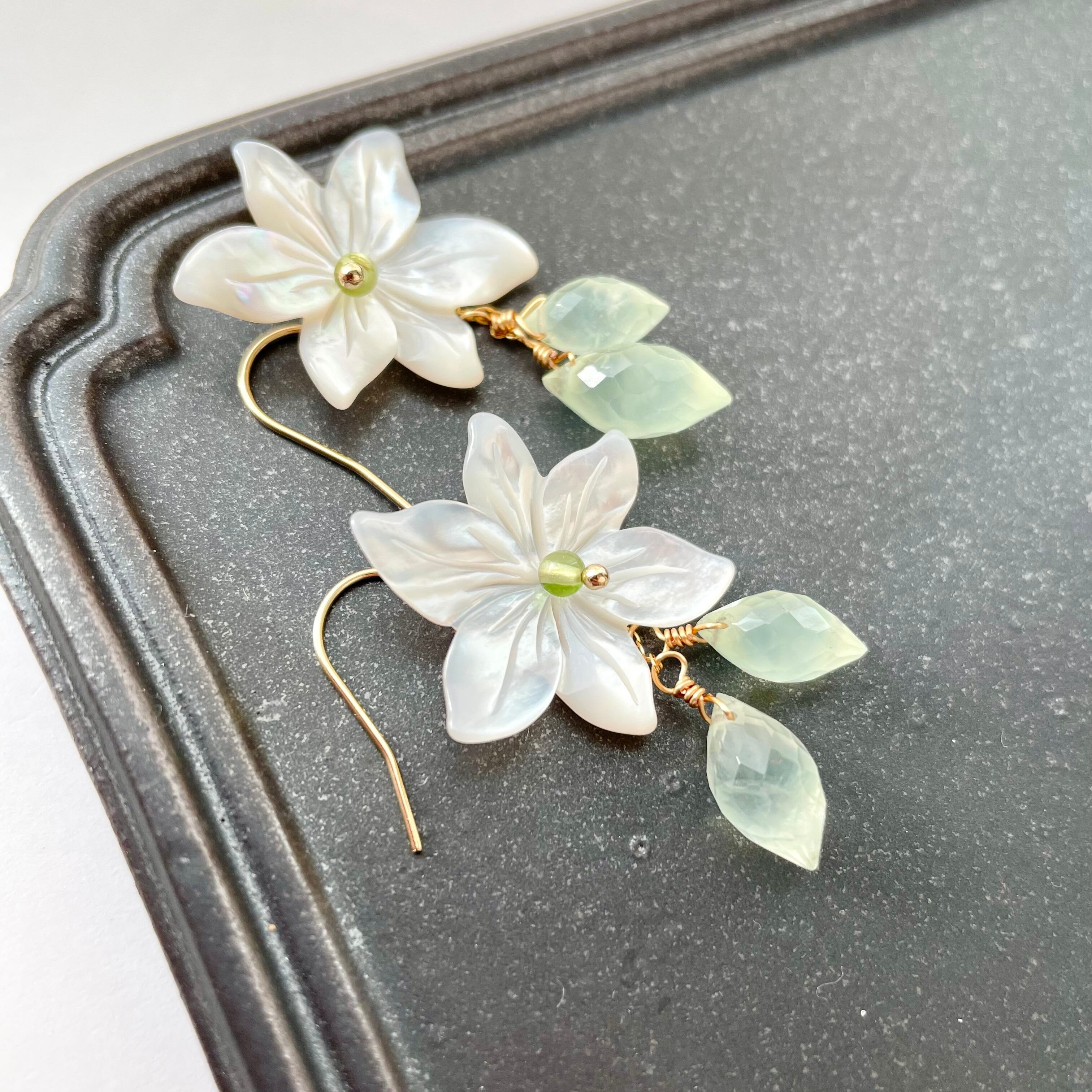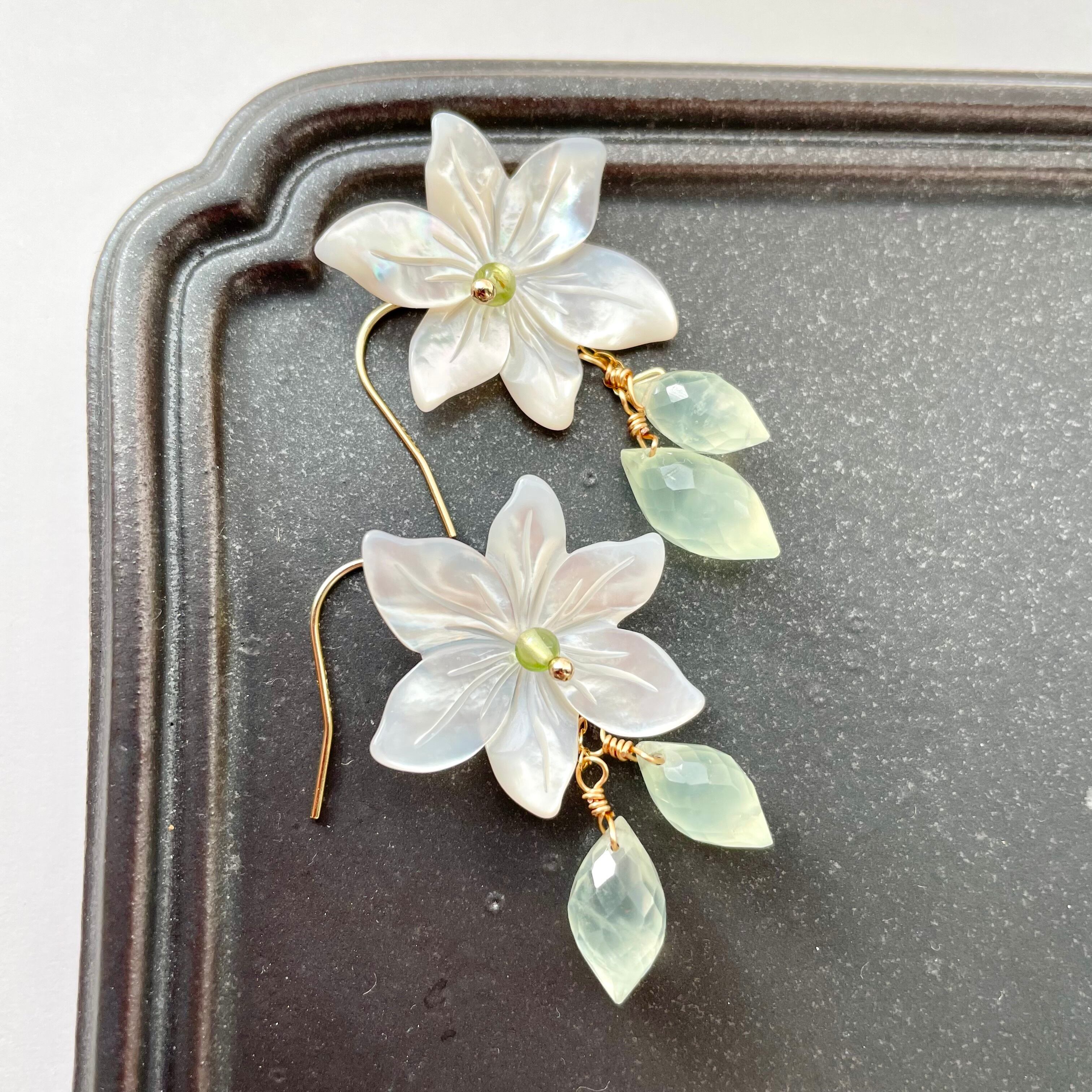精巧なカービング✳︎マザーオブパールのフラワーカービングとプレナイトのピアス